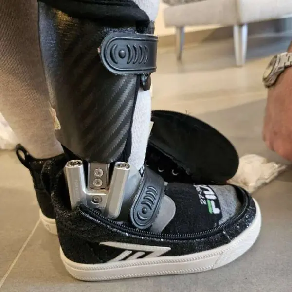 Pour cette attelle, le choix s’est porté sur une chaussure classique 31 large.