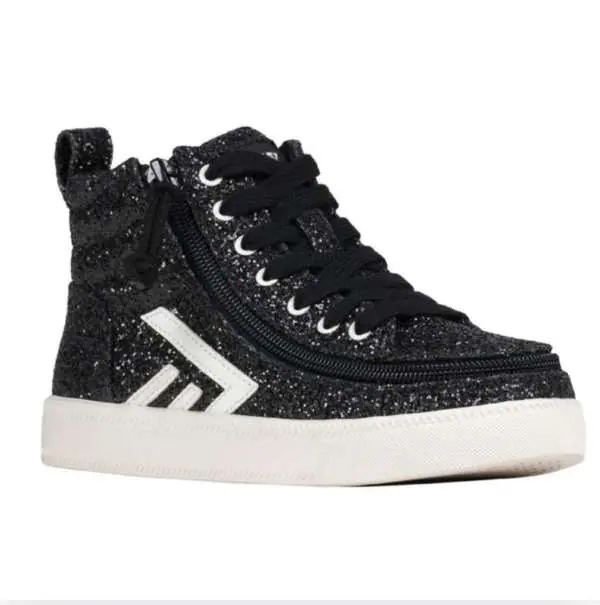 Faites briller chaque pas avec les BILLY CS High Tops Black Glitz, des baskets qui allient style et fonctionnalité. Leur design éclatant attire tous les regards, tandis que leur silhouette BILLY CS assure un confort exceptionnel. Ces chaussures Billyfootwear sont dotées de lacets réglables pour un ajustement personnalisé, d’inserts amovibles pour une profondeur accrue si nécessaire, et d’une fermeture zippée enveloppante pour une commodité sans pareille. Vous allez adorer ces petites merveilles scintillantes. Enfilez-les et brillez !